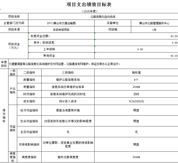 | 071004 | 公路信息化自动系统 | 432000 | 【项目概况】:交通量调查等公路信息化系统维护及外网运营、公路通信专网维护。 | 【总体目标】 交通量调查等公路信息化系统维护及外网运营、公路通信专网维护。保证日常办公正常运行。 【产出指标-数量指标】 指标1:维护公路信息系统(8个) 【产出指标-质量指标】 指标1:信息系统日常维护合格率(≥98%) 【产出指标-时效指标】 指标1:信息系统维护完成的及时性(及时) 【产出指标-成本指标】 指标1:预计投入成本(≤432000元) 【效益指标-经济效益指标】 指标1:提高当地营商环境(明显) 【效益指标-社会效益指标】 指标1:对促进政务信息公开情况的影响程度(明显) 【效益指标-生态效益指标】 指标1:无(无) 【效益指标-可持续影响指标】 指标1:对单位履职、促进事业发展的持续影响程度(明显) 【满意度指标-服务对象满意度指标】 指标1:服务对象满意度(≥98%) |