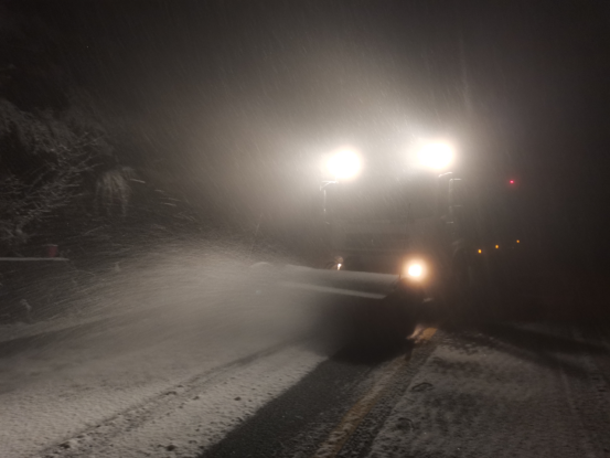 三是高效协作,全力开展铲雪除冰。坚持“机械为主、人工为辅、即下即扫”的原则,科学调度扫雪力量。带队领导时刻与气象部门保持联系,实时分享天气变化信息,第一时间跟踪督导和指挥调度;扫雪车不间断开展循环作业,快速清理路面积雪,人工队伍重点清理机械难以覆盖的边角部位;在急弯陡坡、桥面等易结冰路段及时抛撒融雪剂,防止路面打滑,最大限度减少冰雪对交通的影响。
