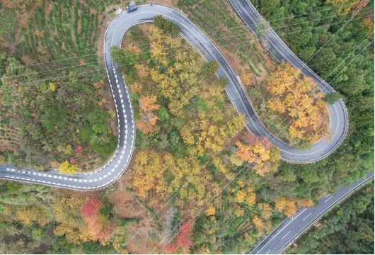 在歙县南部的起伏群山中,公路如同一位技艺精湛的画师,以大地为宣纸,尽情挥洒笔墨。它们依山势盘旋、起伏,线条流畅而富有韵律。路边的乌桕、枫香、山核桃树披上五彩外衣,赤红、明黄、赭石色的枝叶与墨绿色山体交织成一片锦绣。洁净的沥青路面,在这浓郁秋色中化作一条沉稳的墨线——时而缠绕山腰,时而隐入谷底,恰到好处地分割着色彩,梳理出秋景的层次与节奏。