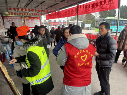 在徽州区城北客运站,志愿者们在候车场内向过往乘客发放春运普法宣传单,用浅显易懂的方式普及公路安全法律法规,引导大家文明乘车、安全出行,切实增强群众法治意识与安全防护能力,全力护航春运旅途平安有序。