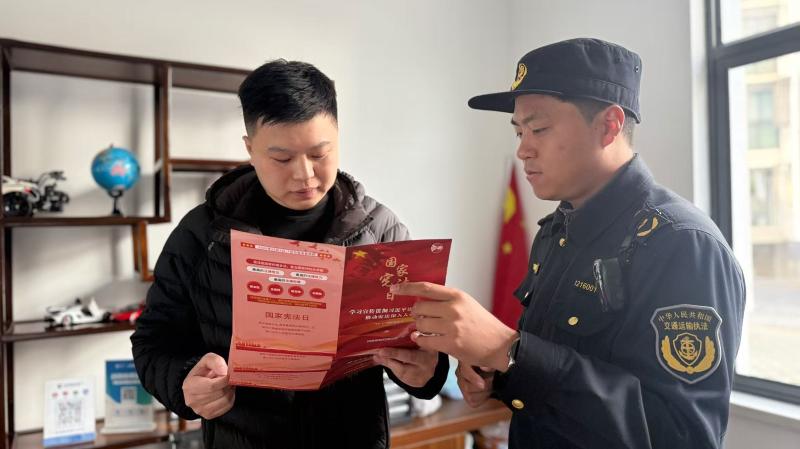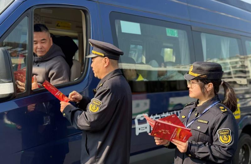 多维赋能,构建全域普法网络。立足交通运输行业流动性、广泛性特点,大队构建“重点区域全覆盖、行业主体全渗透”的普法格局:在高铁北站、市客运总站等枢纽,执法人员化身“普法宣传员”,面对面解读宪法中公民出行权益保障条款,结合典型案例明晰法律边界、违法后果及维权路径;在国省干线沿线,流动宣讲深入村镇,聚焦公路保护、安全通行等群众关切,打通法治宣传“最后一公里”;依托北站执法岗亭LED屏循环播放宪法标语、法治短片,打造沉浸式宣传阵地;同时将普法融入入企执法检查,针对客运企业合规经营、安全生产需求开展“点对点”宣讲,推动法治理念融入行业运营全链条。