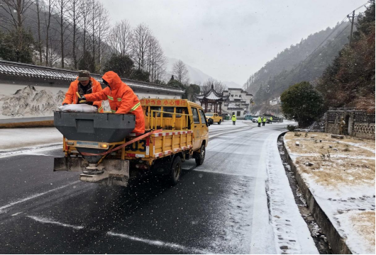 雪越下越紧,S347昱岭关路段蜿蜒穿行于群山之间,积雪渐厚,部分路面开始出现冰冻现象。歙县分中心迅速行动,全面升级应对工作,立即组织应急抢险队伍,调集融雪剂、防滑料及除雪设备,第一时间赶赴昱岭关等积雪较重路段。撒布车开始循环作业,播撒融雪剂,养护工人手持铁锹、扫帚等,配合机械进行人工除雪,并在急弯处铺撒防滑料。与此同时,分中心加强与气象、执法支队的联动协作,实时掌握天气变化与路面状况,引导车辆谨慎通行。