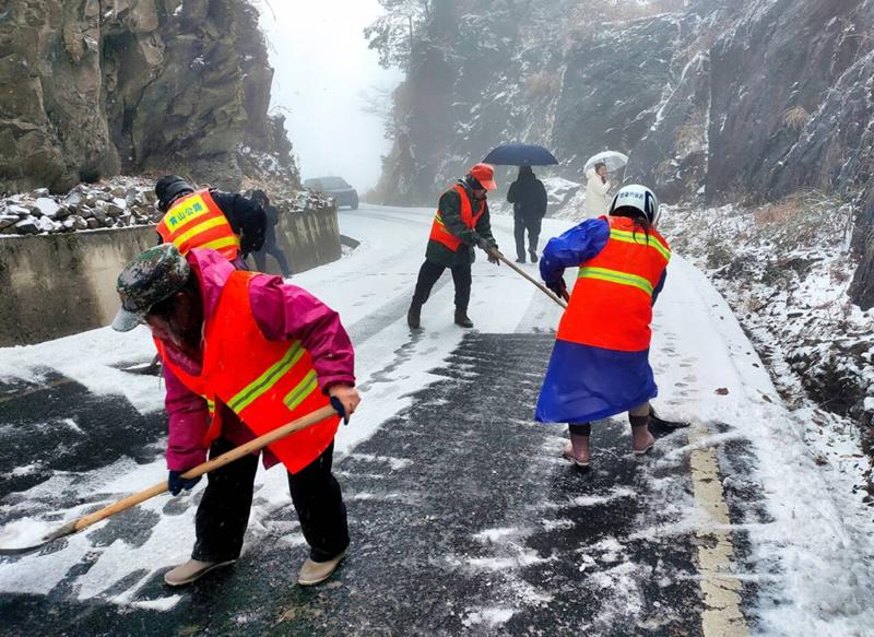 1月20日,黄山市公路中心休宁分中心组织抢险人员三路并进对璜尖岭、黄土岭、右龙岭等高海拔越岭路段积雪进行清除抢险,保障公路安全通行民众安全出行。