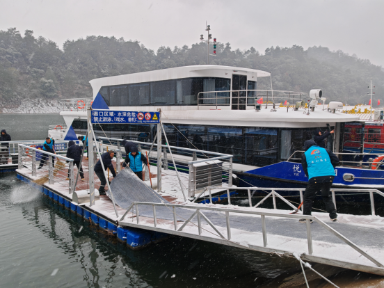 暖心服务,传递黄山温情。海事工作人员顶风冒雪,迅速组织志愿者携带铁锹、雪铲等工具奔赴港区码头,清除通道、船舶靠泊区及人员要道的积雪冰层,为船舶靠泊、企业作业及人员通行开辟了“平安路”。深入太平湖、新安江等重点水域及客流集中渡口,进行现场驻守与秩序维护,搀扶老人、小孩等行动不便旅客上下船,引导船舶谨慎驾驶,确保渡运等重点航线安全运营,让安全与温暖同行。