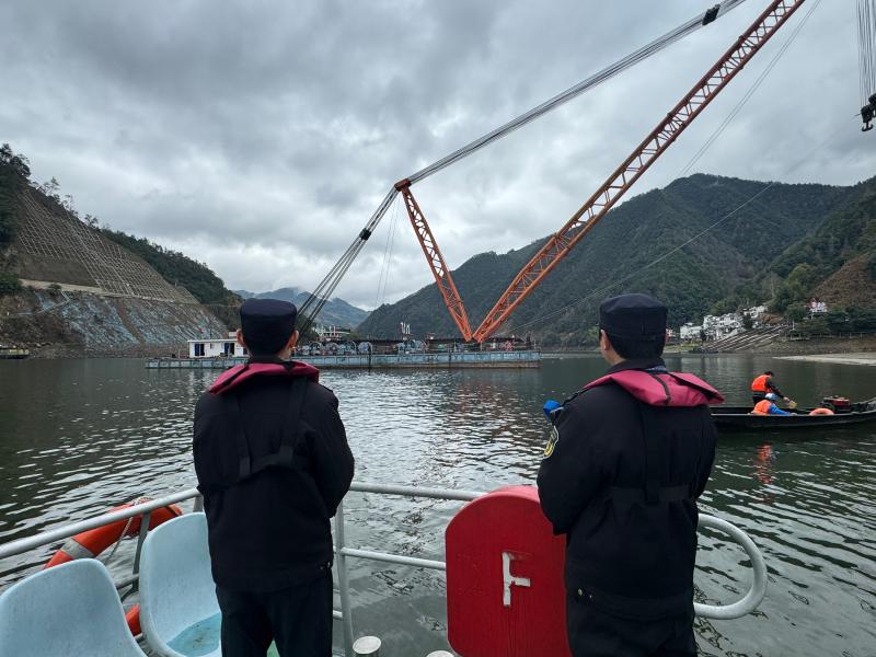 “施工期间,一定要按规定显示信号,加强瞭望,主动避让过往船舶。”在施工现场,执法人员反复叮嘱施工方安全负责人。为保障施工水域通航秩序井然,该大队不仅指导施工单位优化了临时通航方案,还在关键时段调派执法船艇进行现场驻守,通过甚高频、警报等方式提醒过往船舶减速慢行、谨慎通过。2026年3月2日下午,在交通部门的全力护航下,歙县小川大桥首片钢箱梁顺利完成吊装,项目成功向前推进。