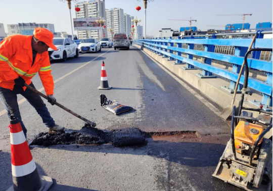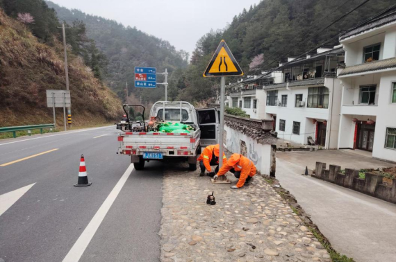 对巡查发现的路面坑槽、裂缝等病害及时进行切割、填补、压实,确保路面平整畅通,减少车辆通行安全隐患;对歪斜、倒伏、破损及模糊不清的标志标牌,逐一进行扶正、清理、校准,对无法修复的及时更换,确保标志标牌清晰醒目、指引精准,为过往车辆和行人提供安全、明确的通行指引,切实防范通行风险。
