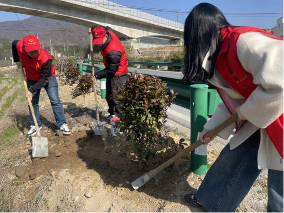 活动现场,志愿者们身着红色志愿马甲,手持铁锹、锄头,分工协作、干劲十足。大家挥锹挖坑、扶苗培土、踩实浇水,每一道工序都一丝不苟。在默契配合下,一株株红叶石楠在公路沿线空地扎根挺立,为春日公路增添了勃勃生机。