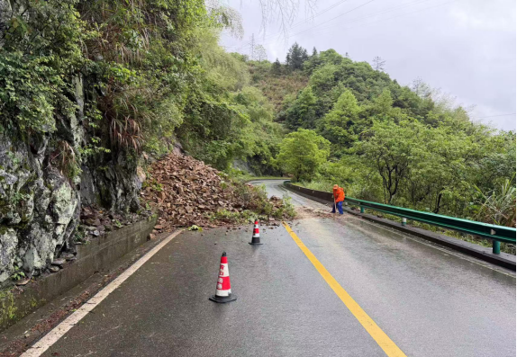 4月29日下午,受强降雨天气影响,S103线K358+070路段突发山体塌方,百余方土石倾泻至路面并侵占大部分通行区域,造成该路段通行受阻,险情较为紧急,对过往群众出行安全构成潜在威胁。